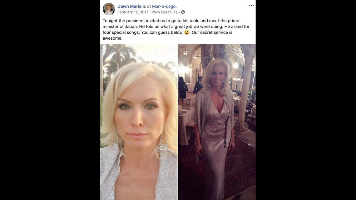 Dawn Basham, one of Trump’s favorite lounge singers, was the evening’s entertainment. A few years before Trump took office Basham had performed at Trump International Golf Club in West Palm Beach, where the former beauty queen’s voice — and her ability to stun in an evening gown — caught the Don’s attention.