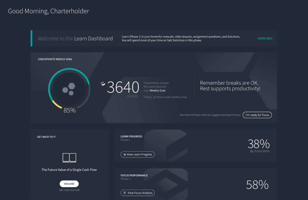 AnalystPrep offered one of the smoothest onboarding and study flows, with intuitive navigation and responsive customer support. Salt Solutions brought a clean, gamified interface to the table, complete with study goals and visual trackers that helped me stay motivated.