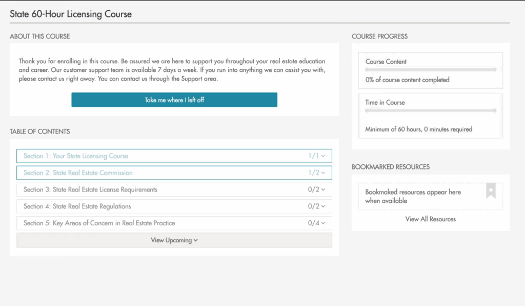 If you find that live classes and a more guided plan help keep you accountable and engaged, then Kaplan Real Estate Education’s Live Online format or the tutoring option from Apex Real Estate School could be a much better fit for your success.