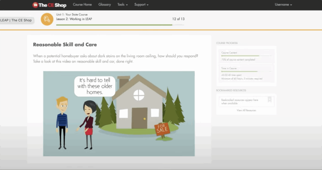 During my review, what stood out was how organized and well-sequenced the platform felt. Progress tracking was crystal clear, and the supplemental tools—like digital flashcards, glossaries, and eBooks—made it easy to reinforce learning outside of the main lessons. The weekly live webinars added a sense of structure and gave students a chance to check in and ask questions in real-time. It’s not the most entertaining course, but it’s one of the most complete, especially if you’re serious about getting licensed and staying licensed in one go.