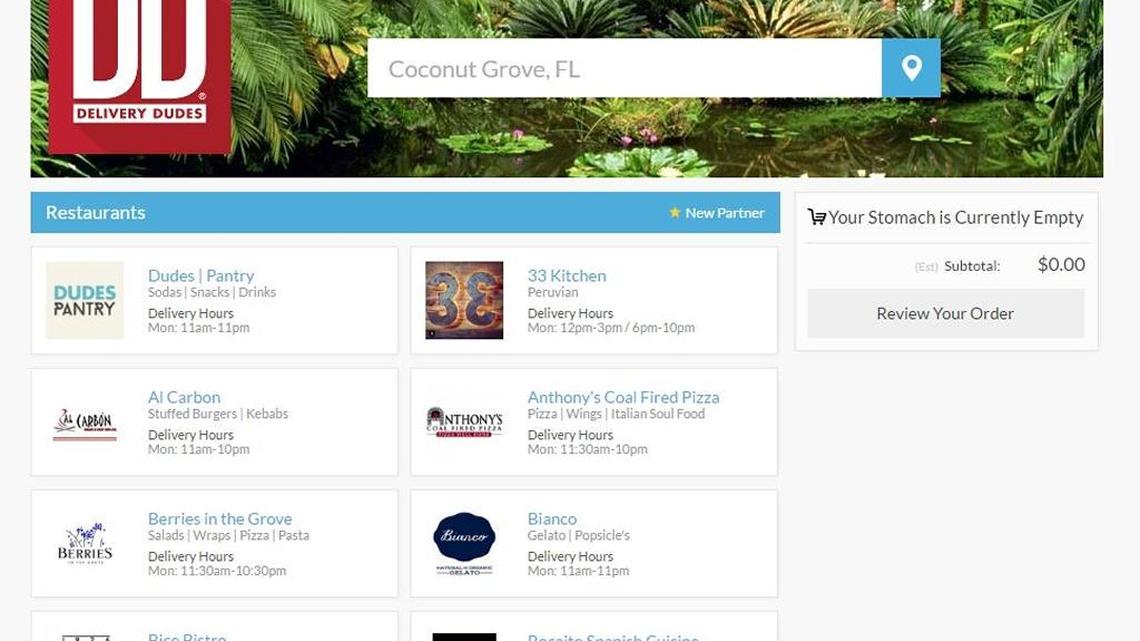 The Coconut Grove site offers more than 30 dining options including Italian, Indian, Mexican, Spanish, Greek and more. There are Delivery Dudes in many other South Florida locations; search for your neighborhood on the website.