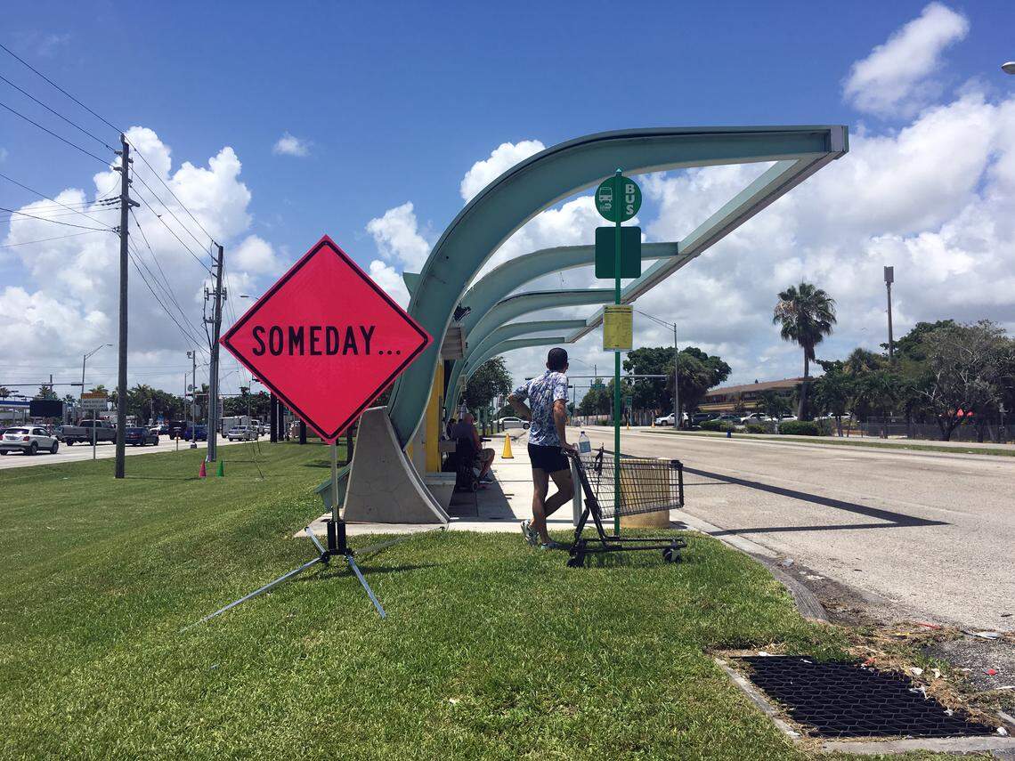 Another sign, which reads “someday...” is next to a bus stop that lost its roof and side paneling to Hurricane Irma and wasn’t repaired for a year.
