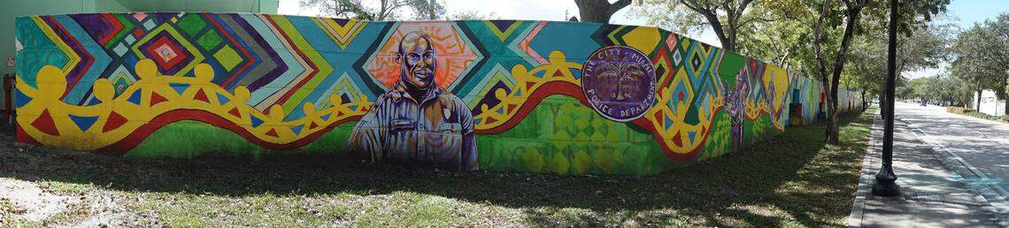 The 300-by-8 foot brick wall that surrounds the North District Police Substation at 1000 NW 62nd St. is covered with a vivid mural depicting children and police in the community, jubilant faces and an “I Love Liberty City” logo.
