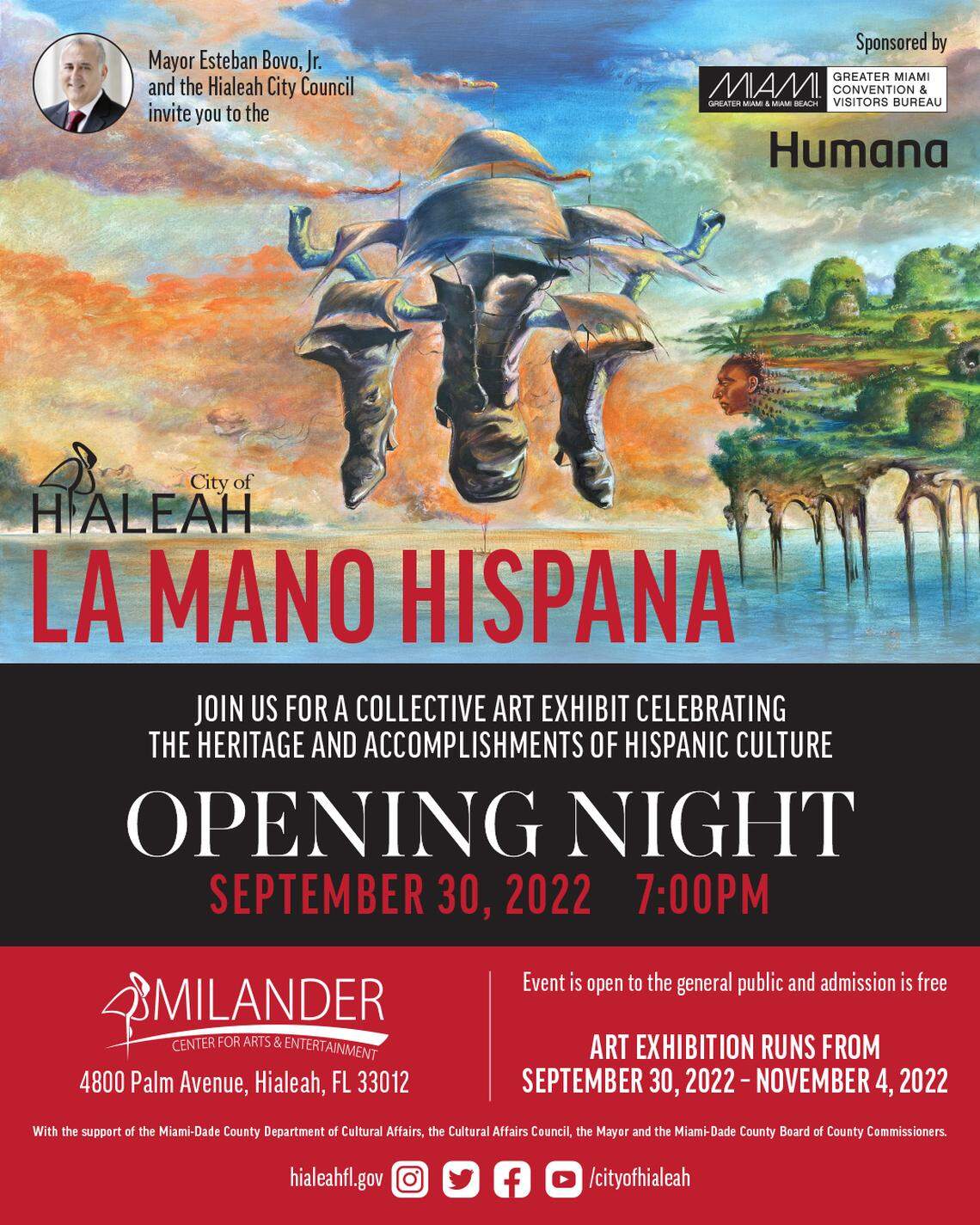 The City of Hialeah celebrates Hispanic Heritage Month with La Mano Hispana, an art show at the Milander Center with work by 85 artists from 12 Latin American countries that each exalt their respective cultures and reflect its idiosyncrasies through art.