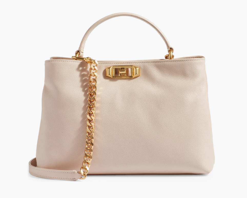 With multiple compartments, this Rebecca Minkoff top handle bag will keep all your belongings organized so you never have to spend 10 minutes searching for your favorite lipgloss. It has a turnlock closure and a removable, adjustable crossbody strap.