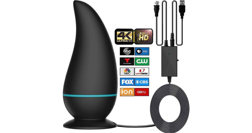 In addition, this indoor TV antenna is waterproof, so it won’t be damaged by an accidental spill indoors or rain outdoors if you install it outside. It offers 360-degree reception and can pick up signals from up to 380 miles away.
