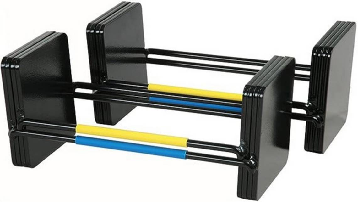 These dumbbells adjust easily with simple click-and-lock technology. They’re Swiss-engineered for smooth and consistent lifts, and the plates are held tightly in place to prevent shifting and clanging while you work out. They also feature steel plates and steel-knurled handles for an easy and secure grip.