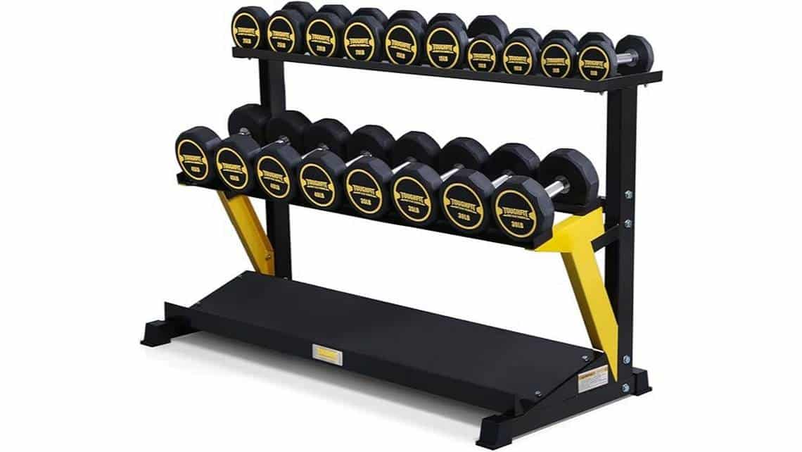If you’re searching for a good-looking dumbbell set that comes with a storage rack, you can’t go wrong with this ToughFit Dumbbell Set. With their striking black and yellow color palette and unique decagon design, these weights will look nice and stay put throughout your whole workout.