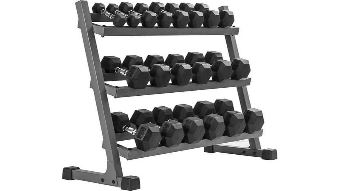 Worried about where you’re going to store your dumbbells? Luckily, this set comes with a 46-inch triple rack with plenty of space for each pair and an angled design for easy retrieval and replacement.
