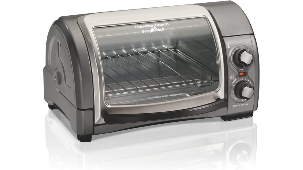 Best For Anyone Who Prioritizes Countertop Space or Struggles With Traditional Toaster Oven Doors: Hamilton Beach Easy Reach 4-Slice Countertop Toaster Oven