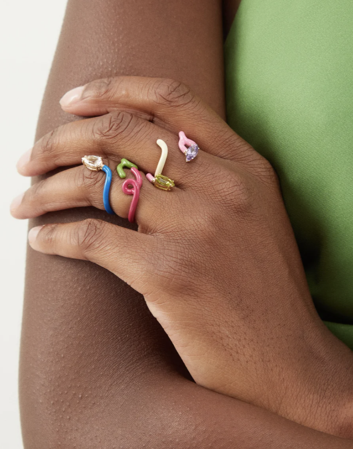 Something else from MatchesFashion’s high-end toy box. Intertwining vines in pastel shades shape this serpentine ring. You can choose versions topped with peridot, amethyst or clear crystal.