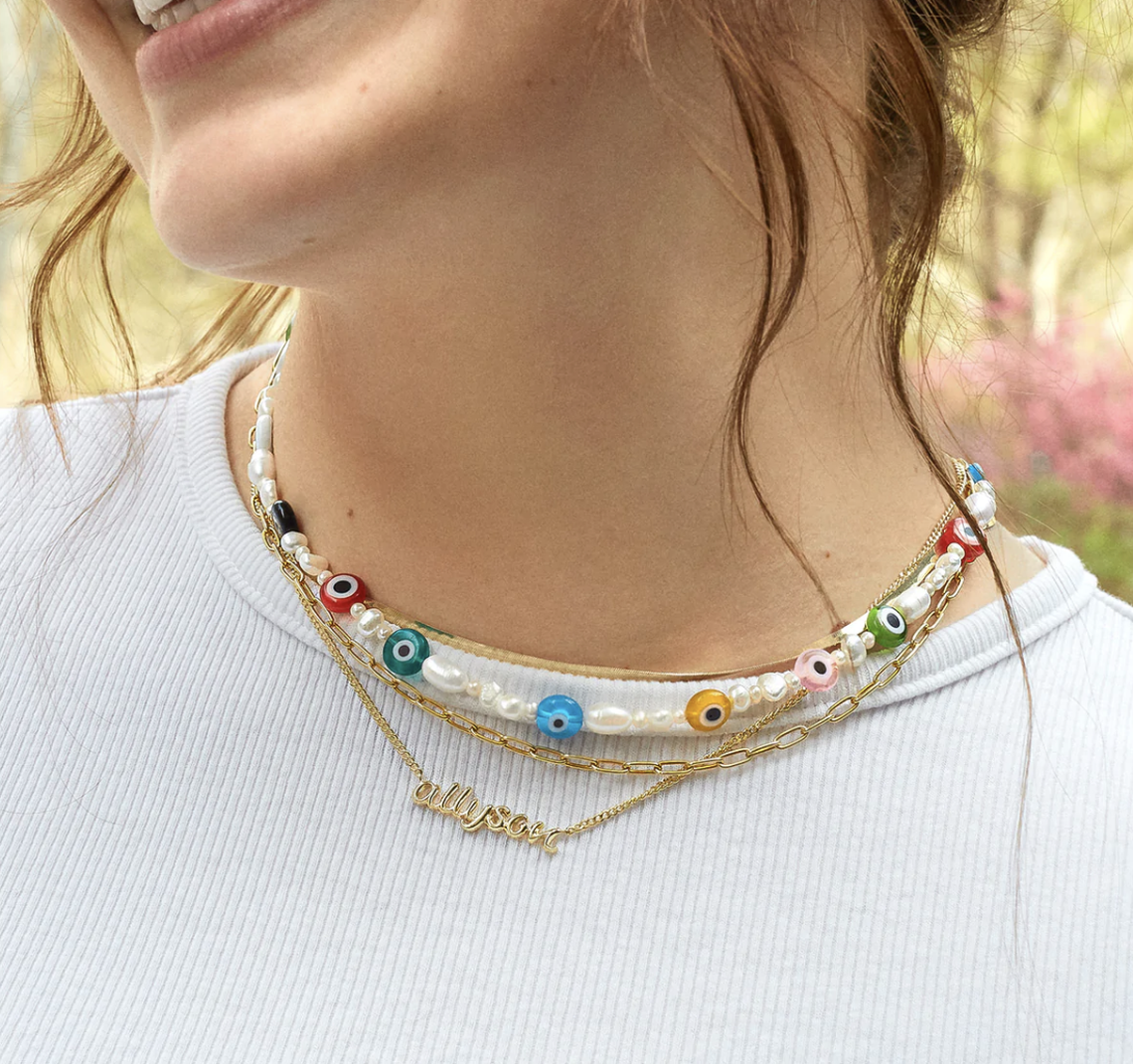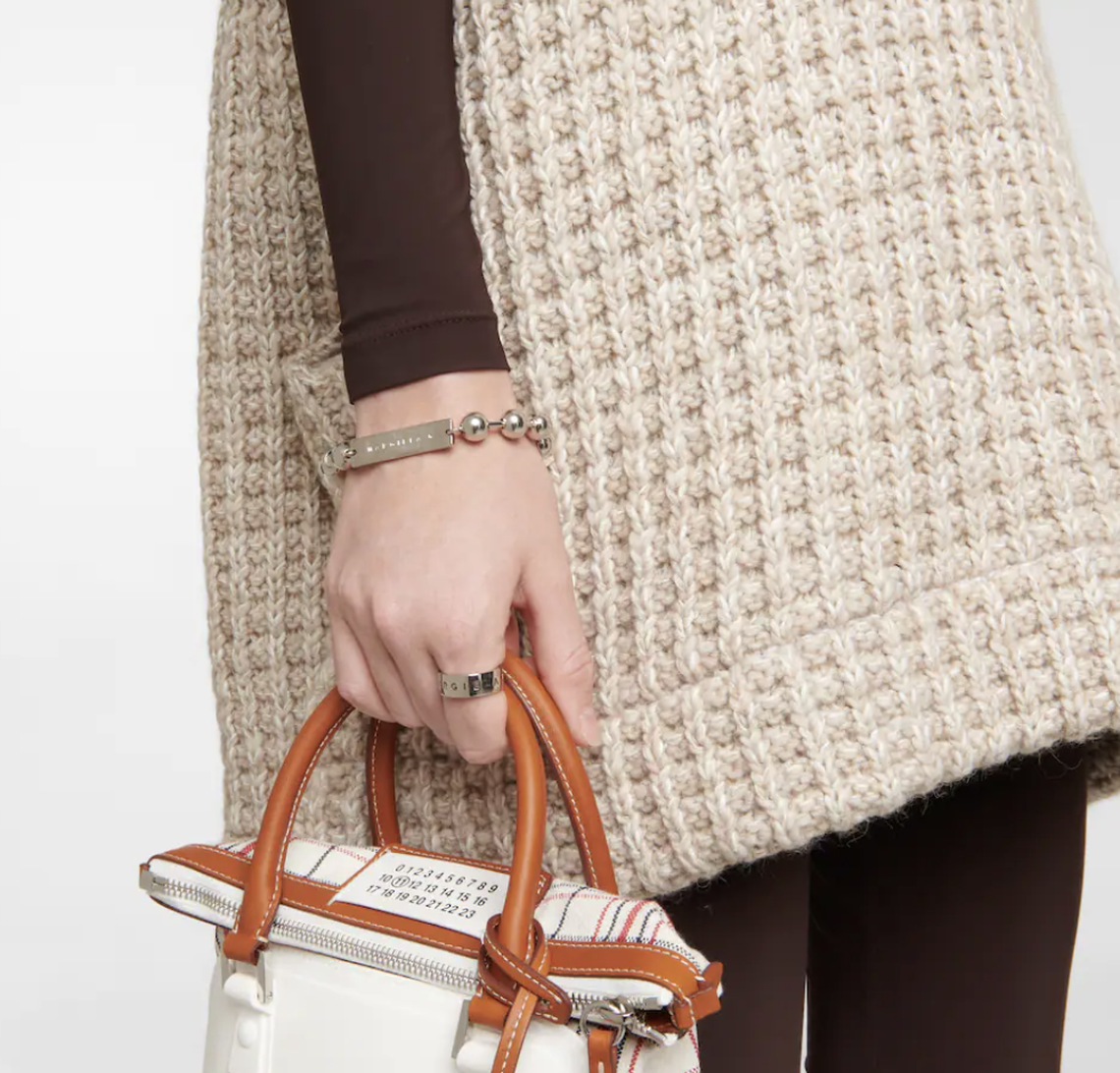 Remember the days of chunky gold nameplates? They’re back, sort of. This is a much cleaner, sleeker version of the older style, but still a statement piece, in silver or gold.