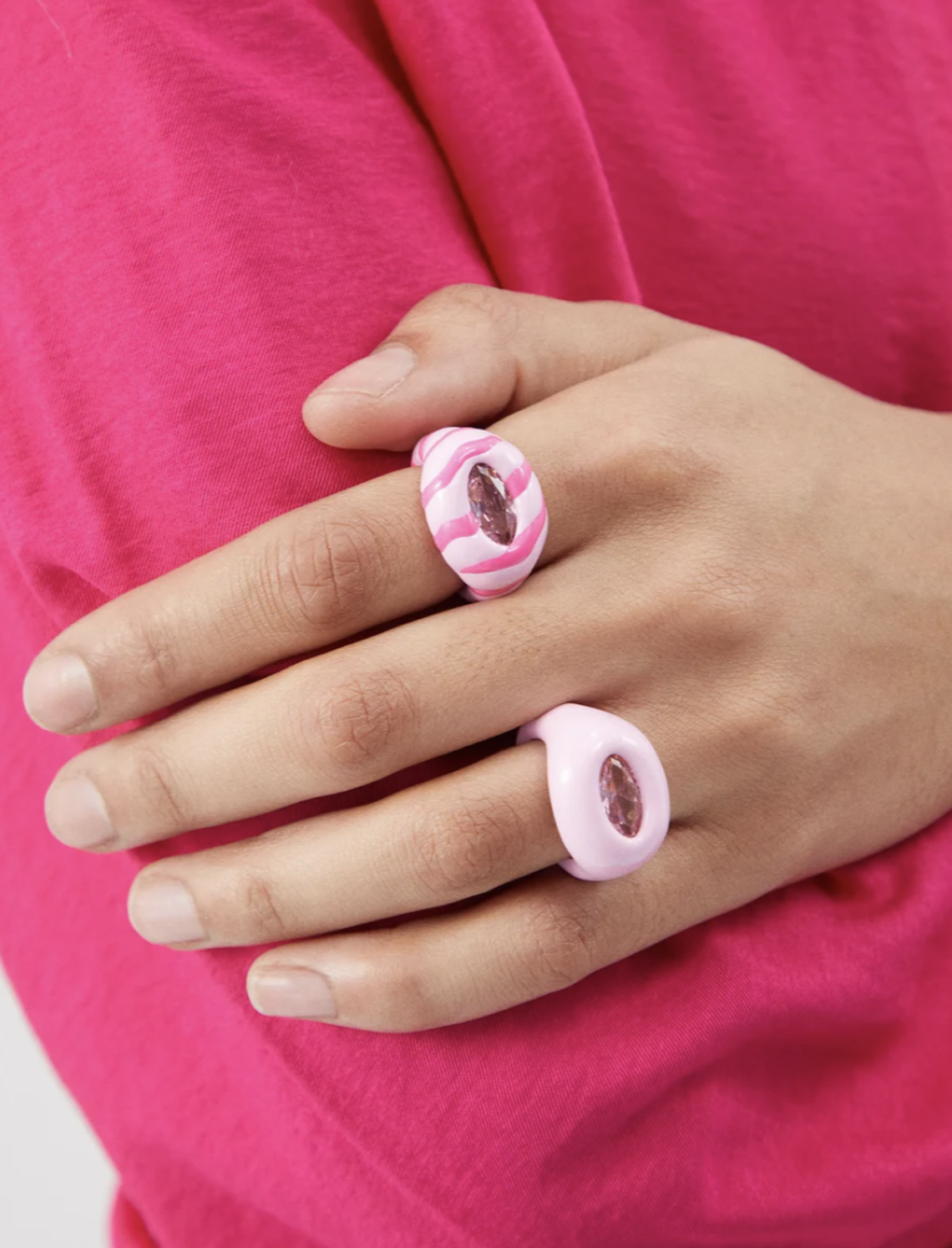 A chunky, colorful bauble looks like candy, if candy was 18K gold-plated with a glistening zirconia in the middle. The design is inspired by vibrant children’s toys, and definitely gives off that vibe.