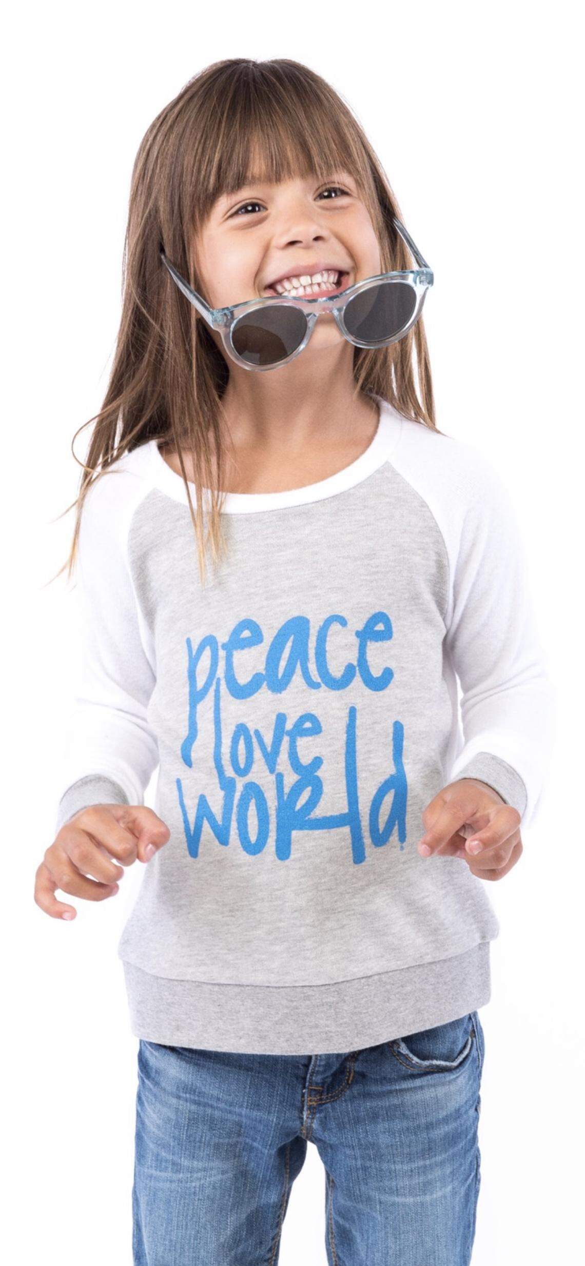 “Comfy Top” for kids , in soft fabric with grey body, white sleeves, and the words in blue “peace love world” ($18, Peaceloveworld.com)