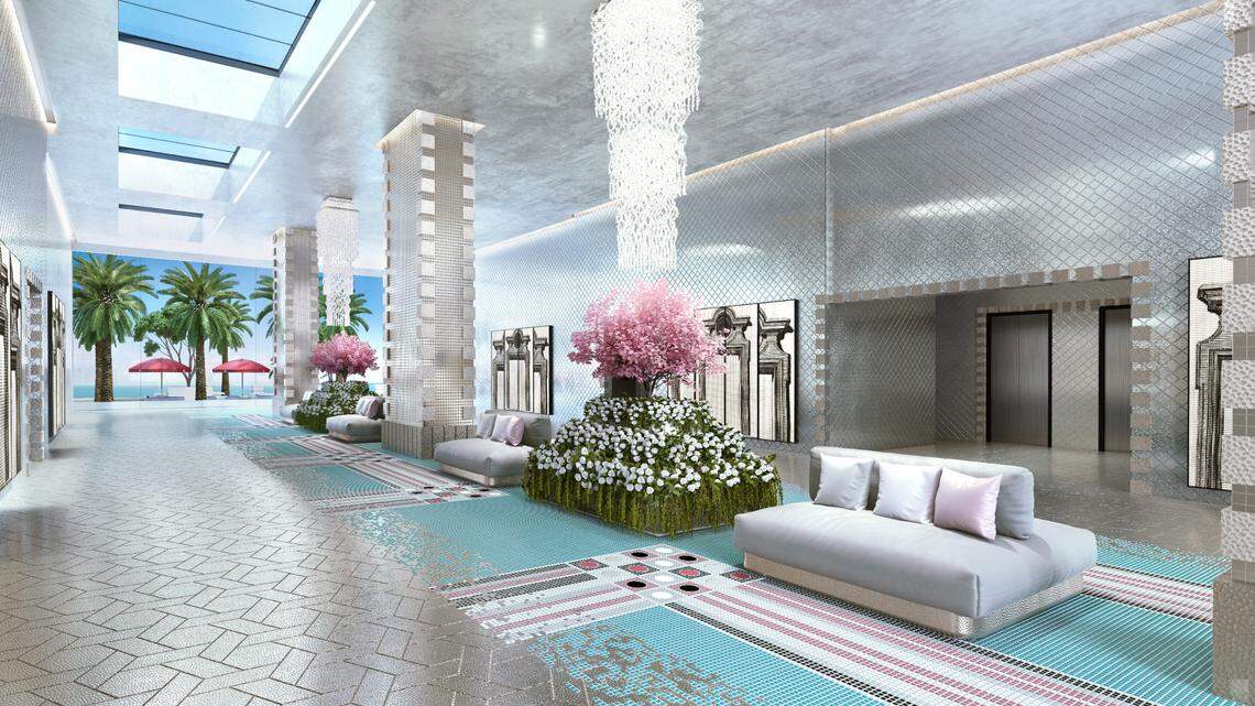 When The Trump Group (no relation to POTUS) owners, Jules and Stephanie, traveled to Paris to meet the legendary Chanel and Fendi designer, they never imaged they were commissioning the only Karl Lagerfeld-designed residential lobbies to ever exist in the country. “We built the world’s finest residences, and when he saw what we were doing, it was a match made in heaven,” said Michael Goldstein, president of sales for The Trump Group. Lagerfeld got to work right away, sketching his vision for the lobbies at that first meeting. “He knew what he wanted and he created it.” The audacious designer’s impeccable eye for detail and ability to create a one-of-a-kind recherché setting is seen throughout the two lobbies including 12-foot glass panels that are etched with Lagerfeld’s personal photos of Roman fountains, parquet-pattern floors made of cutting-edge silvered hammered metal, silver-leafed walls textured with swans, mosaic tile designs that resemble intricate rugs, and flowing fountains surrounded by lush blooming flowers. Although it’s unfortunate the designer will never see his designs come to life, his team continues to be heavily involved in the project. The South Tower is set for completion in 2021, with the North Tower, or Boutique Tower, completed in 2022.