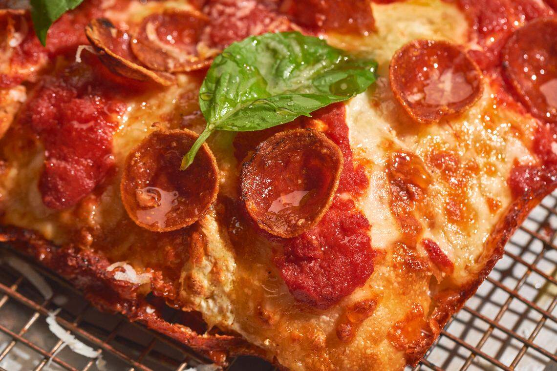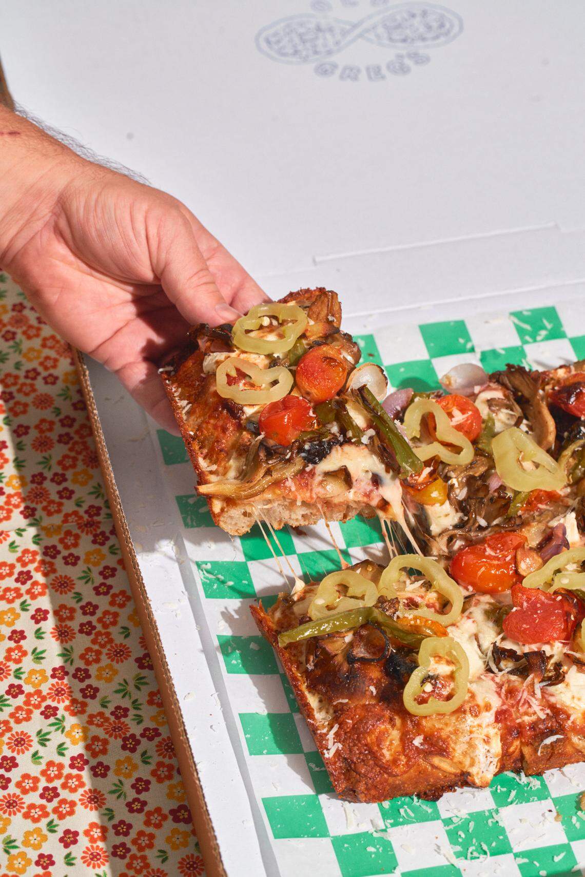 What he came up with is something unique, a square pie that combines the best of Roman, Sicilian and American sheet pan pizzas. In an era when Neapolitan shops skimp on toppings, he loads his with ingredients piled high on a crust that’s thick and airy. He called his pop-up Old Greg’s, the nickname fellow line cooks had given him, and the name he gave to his prized sourdough starter that makes the dough so fluffy.