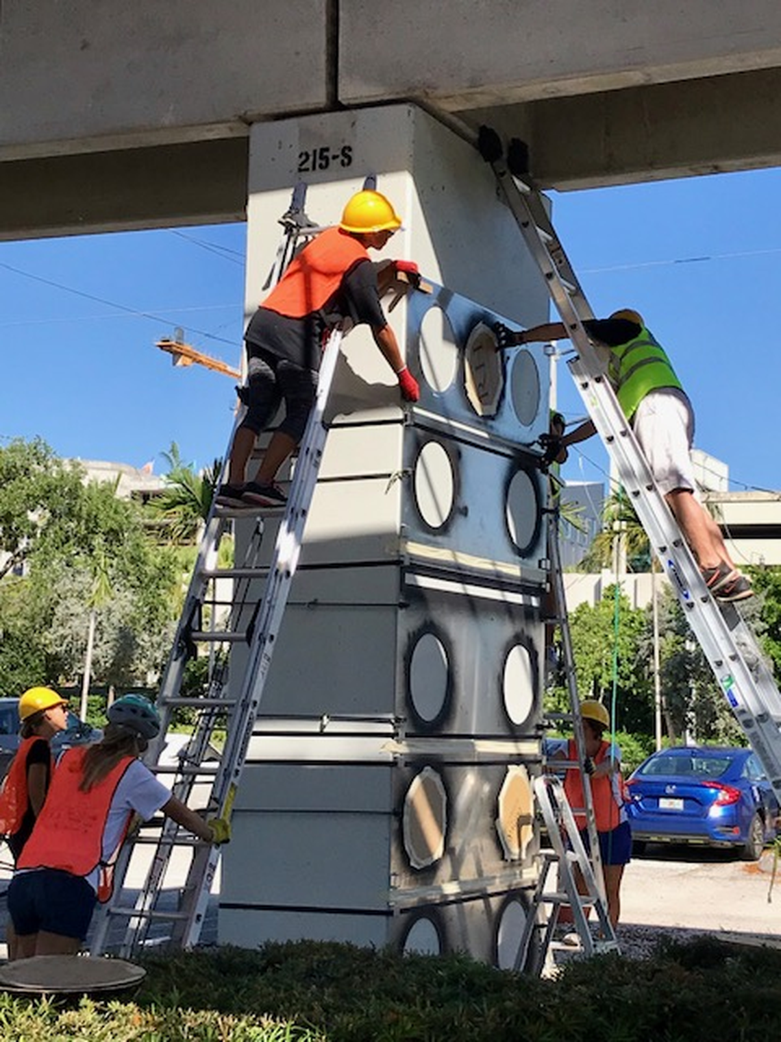 After winning an Ellies award and $2,500 grant from ArtCenter/South Florida (now Oolite Arts) and the Miami Foundation, plus donations from Rust-Oleum, Brightway Insurance and MWL Engineering, Droga was able to fast-track the project with help from Irene Hegedus and Carol Wilson at Miami-Dade County’s transportation and public works department, who got the pylons cleaned. He’s doing the work for free.