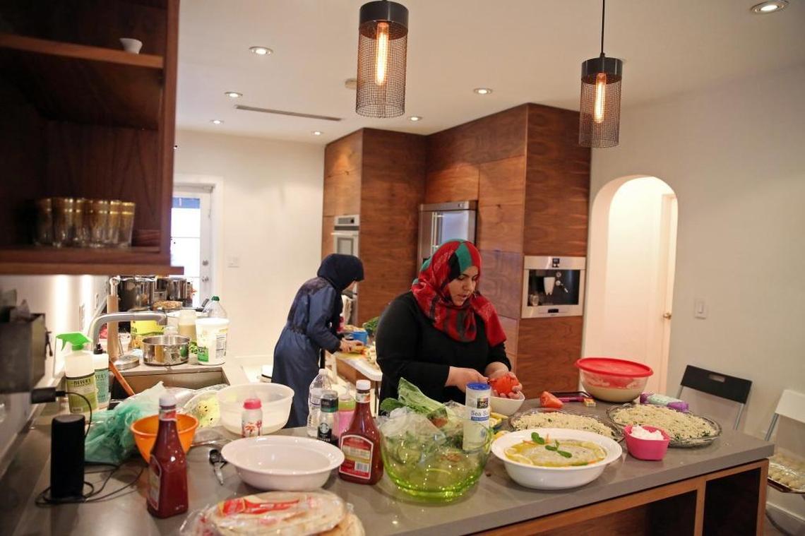 Kholoud Al Shareef, 31, and Yasmeen Zobi, 23, move from one billowing pot to the next, speaking to one another in Arabic as they try to figure out the stainless-steel German appliances in this home that is not their own. Their faces glisten beneath their hijabs — Kholoud’s the tri-color of the Syrian flag, Yasmeen’s an elegant glitter of black sparkles — as each of the six burners and both ovens warm the sleek kitchen of burled wood cabinets, travertine tile and Edison lights.