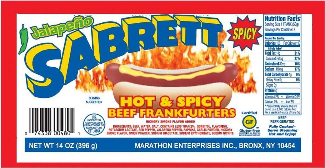 ▪ 14-ounce packs package of Jalapeno Sabrett Spicy Hot & Spicy Beef Frankfurters, UPC code 480.