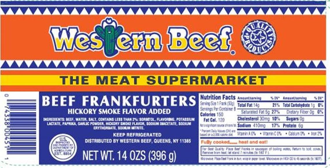 ▪ 14-ounce packs of Western Beef The Meat Supermarket Beef Frankfurters, UPC code 451.