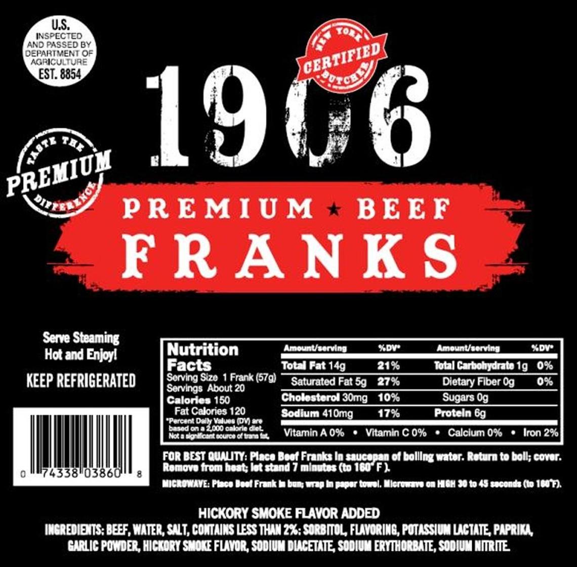 ▪ 2.5-ounce and 14-ounce package of 1906 Premium Beef Franks, UPC code 1906 or 3860.