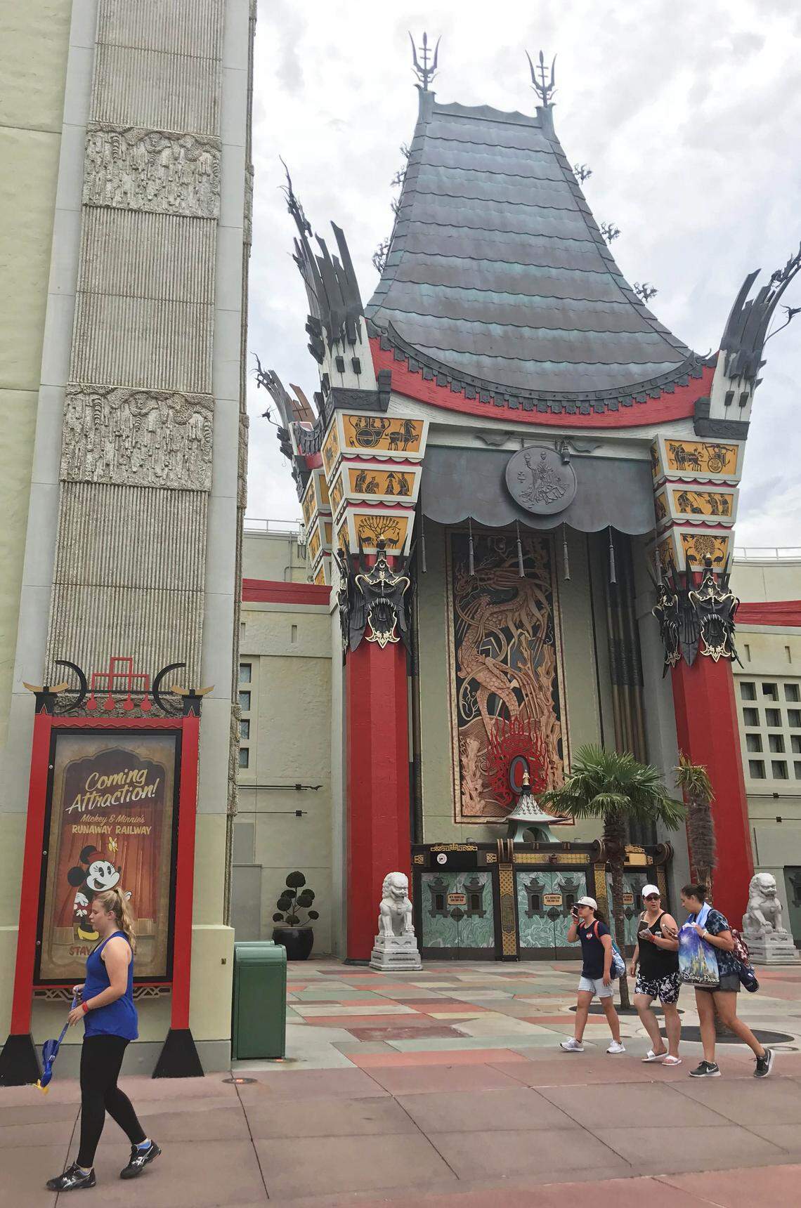 The ride is being built in Grauman’s Chinese Theatre, which used to house the Great Movie Ride. Now posters and signs on the facade promote the new attraction: “We’re imagineering something new.”