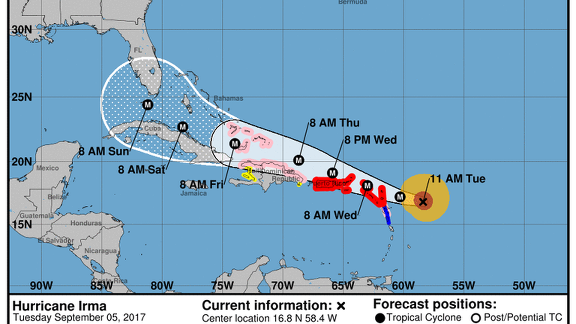 Because Irma is so large, forecasters urged caution in paying too much attention to its exact track. The storm is continuing to roll west at 14 mph, with winds expected to begin battering the Leeward Islands today. A powerful high pressure ridge is steering the storm and will likely stay in place over the next few days, forecasters said. In five days, a trough moving across the U.S. should begin weakening the western edge of the ridge, allowing the storm to slide north. Where Irma makes the turn will determine impacts to Florida.