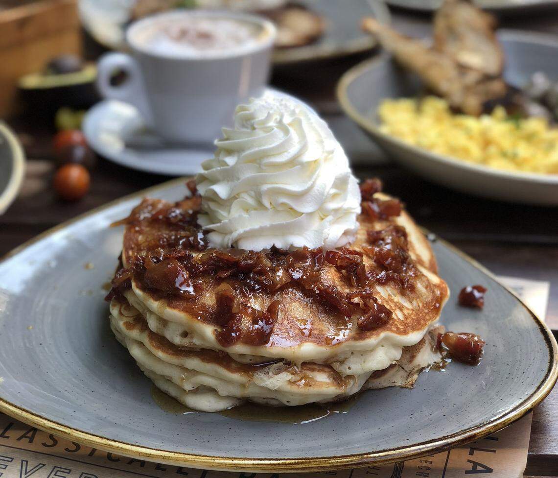 There’s also an ala carte brunch menu available on weekends, which includes kale Benedict, salmon toast, steak and eggs plus our favorite in the bunch, bacon pancakes, which consists of buttermilk pancakes layered with candied bacon shards topped with bacon-infused maple syrup and whipped cream.