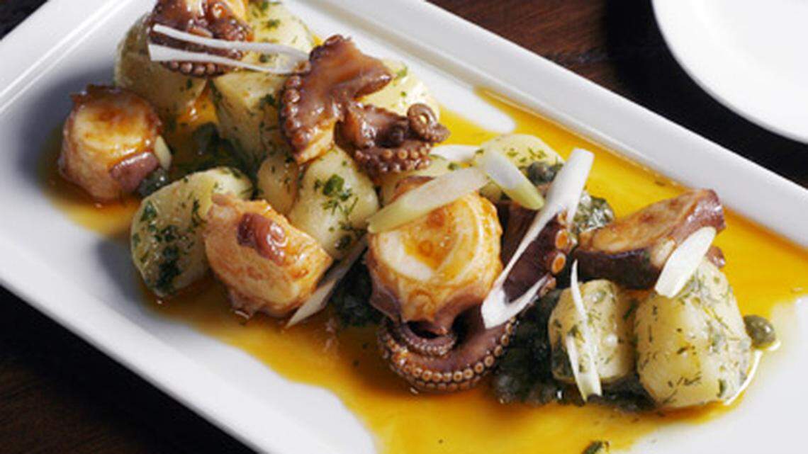 Simple classics such as vinegary boquerones (pickled anchovies), smoky caldo gallego and smushy pan con tomate (tomato bread) are satisfying. Other simple pleasures include a soft-as-honey poached egg with a hash of roughly chopped potatoes and chorizo as well as a bowl of tiny, tender clams with chorizo in an outrageously tasty broth of garlic, chiles and sherry.