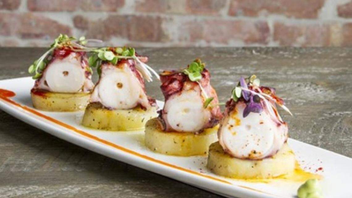 - Thumb-thick octopus chunks served over discs of gently roasted potatoes