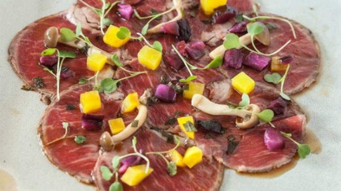 4. Sugarcane Raw Bar Grill’s Japanese-style Akaushi beef carpaccio (pictured) has an earthy bite from pickled mushrooms and an umami finish from truffle ponzu sauce. $16.