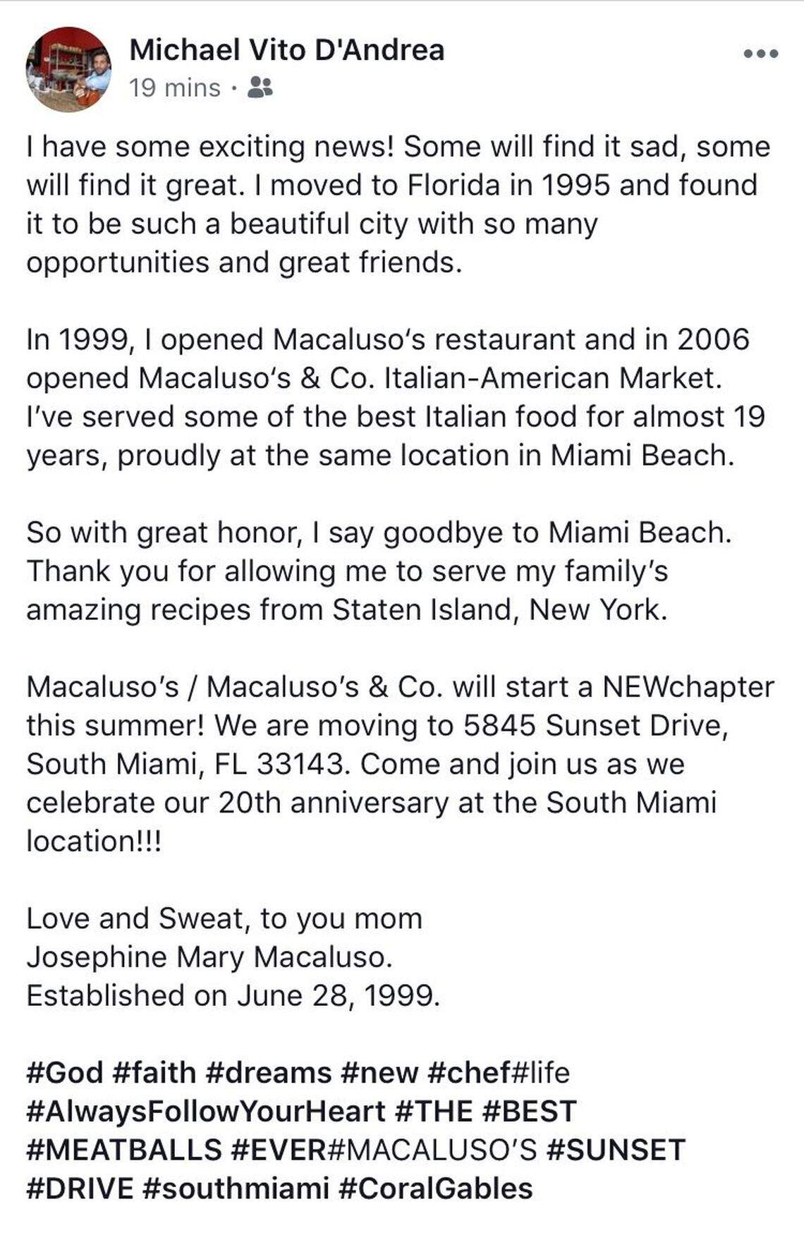 On his Facebook page, he wrote: “So with great honor, I say goodbye to Miami Beach. Thank you for allowing me to serve my family’s amazing recipes from Staten Island, New York. Macaluso’s / Macaluso’s & Co. will start a NEW chapter this summer! ”
