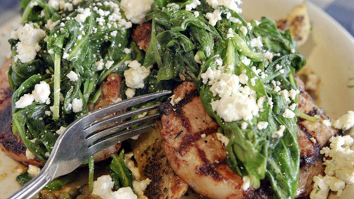 - Complimentary hummus (thin but creamy) served with bread (pay $1 for pita) An appetizer combo that easily feeds four and includes char-grilled keftedes (like Greek burgers with a spicy kick), gyro slices (a flavorful mix of lamb and beef), loukaniko (imported Greek sausage), a wedge of flaky spanakopita (spinach pie) and grilled chicken wings