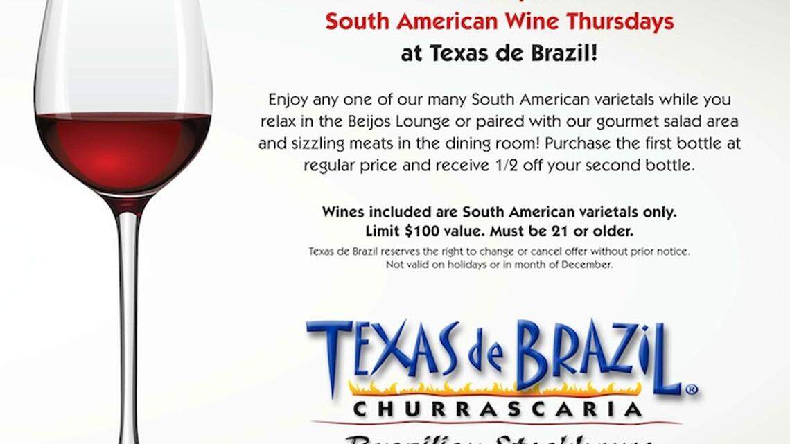 - Every Thursday, purchase a bottle of South American red or white wine and enjoy the second bottle at 50% off. Limit $100, must be 21 or older.