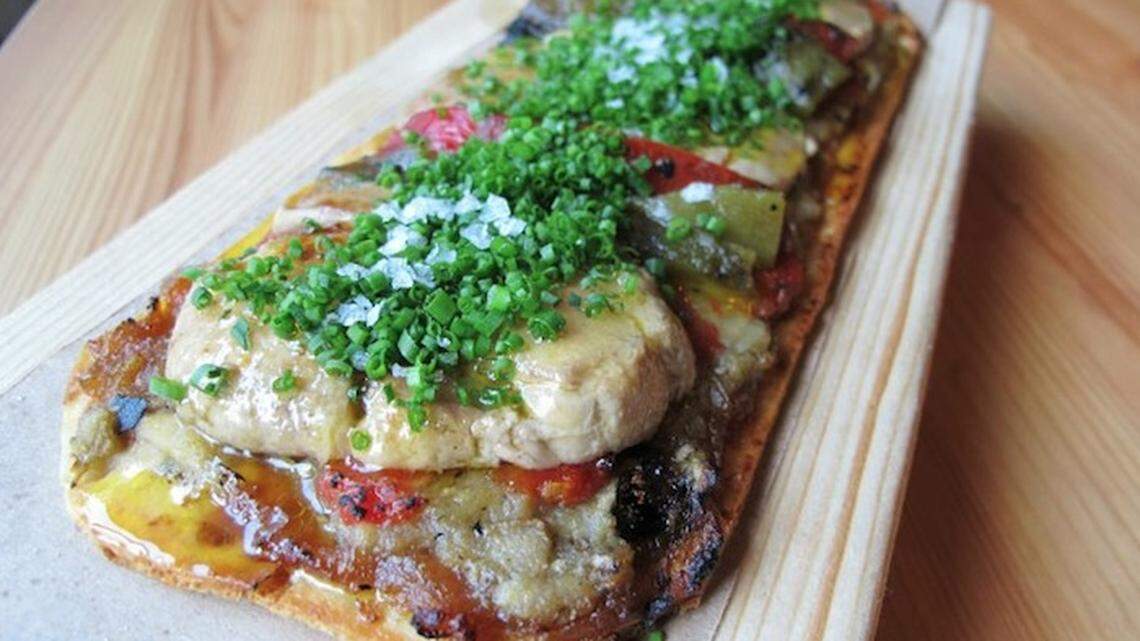 Dinner starts with complimentary pica pica, house-made marinated olives. Segue to plates of Iberico ham or Manchego and Idiazabal cheeses. Menu highlights include brandada de bacalao (a salt cod spread) served with a mini-loaf of Spanish bread; coca flatbread (pictured), topped with a rich melange of foie gras, grilled eggplant and chives; roasted padron peppers tossed with sea salt; piquillo peppers stuffed with garrotxa cheese; butifarra (house-made pork sausage) spiked with brandy and cream; gambas (prawns) with chocolate picada and garlic, and cazuela de mejillones, mussels in a saffron rouille with tomato and garlic.