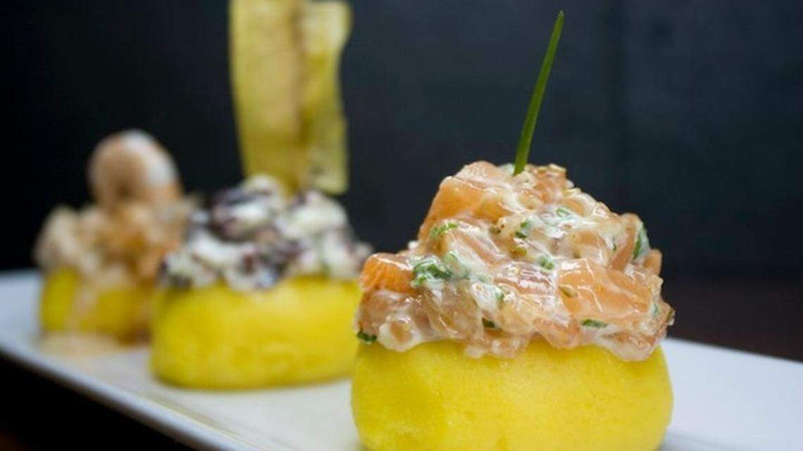 - Conchas al estilo Nikkei – five perky, miso-marinated scallops with a small puddle of passion fruit sauce beneath and a snippet of lemongrass
