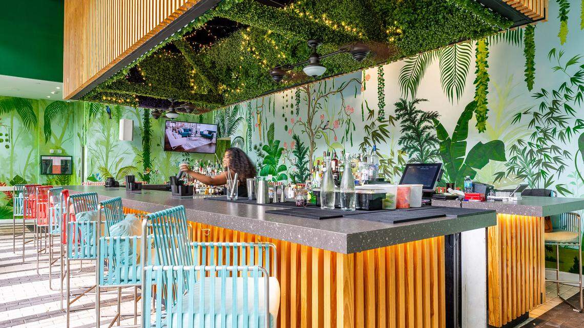 La Sombra takes advantage of that revamped outdoor space, serving a retro mod “Surf and Turf-style menu” in the open air palm-lined courtyard decked out in twinkling lights and a fountain lagoon. The menu offers ceviche made with daily local catch, mangoes and pineapple; octopus in a creamy lemon sauce, as well as pastas, hamburgers and even a quinoa tabbouleh.