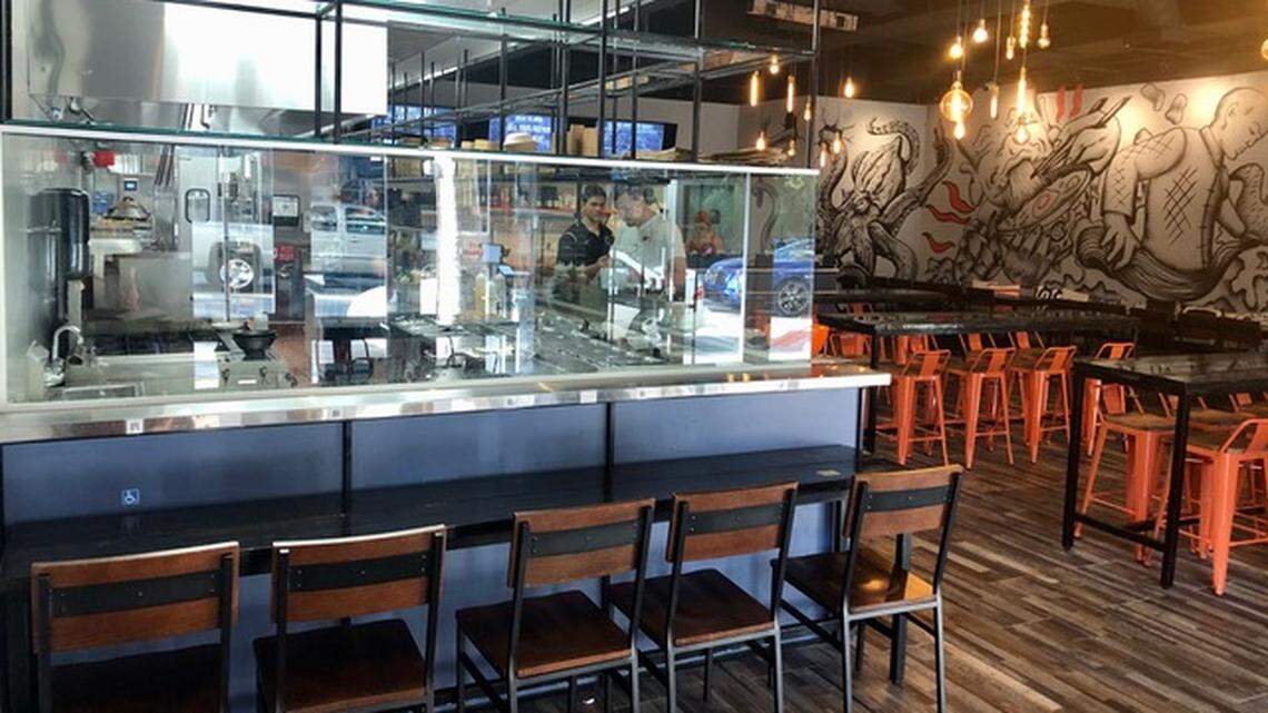 The 2,000-square-foot restaurant features communal tables and hand-painted graffiti art by local artist Ivan Roque.