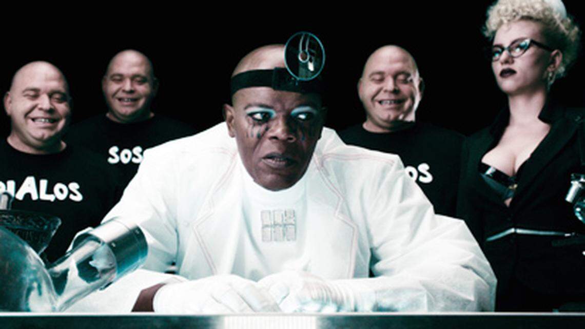 " alt="<font size="2">The Octopus (Samuel L. Jackson, center), Silken Floss (Scarlett Johansson, right) and Phobos (Louis Lombardi, rear) in <font color="#ff0000">The Spirit</font>. Photo credit: Lionsgate/Odd Lot Entertainment. <br /><!-- end forecolor --></font>" />