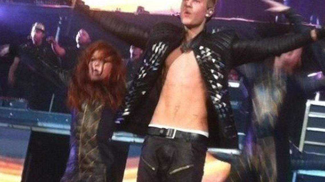 The source of all that pain and pleasure floated onstage on a pair of enormous wings, dressed in white and dark shades, singing All Around the World, the first of many songs (two-thirds of the set list) from his latest album, last year’s Believe. The 18-year old superstar went confidently through a slick production, with 12 dancers, a giant tri-level set and a phalanx of video screens that so filled the stage with Bieber images it was often hard to find the real thing.