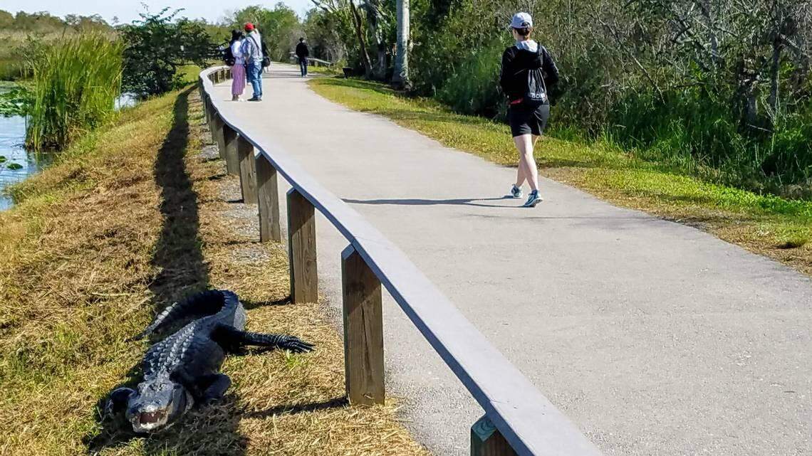 There are a couple of different ways to do this. Head to Shark Valley and ride a bike or take a tram tour or head to the Homestead entrance and walk the Anhinga Trail. Either choice will result in gators,