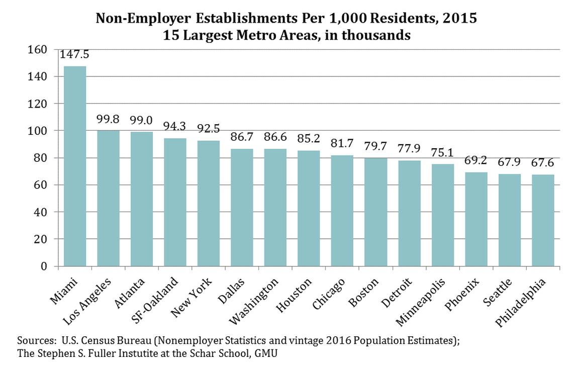Of the 15 largest metros, Miami had the third-largest number of non-employer establishments in 2015, 885,500, and on a per capita basis, it was No. 1.