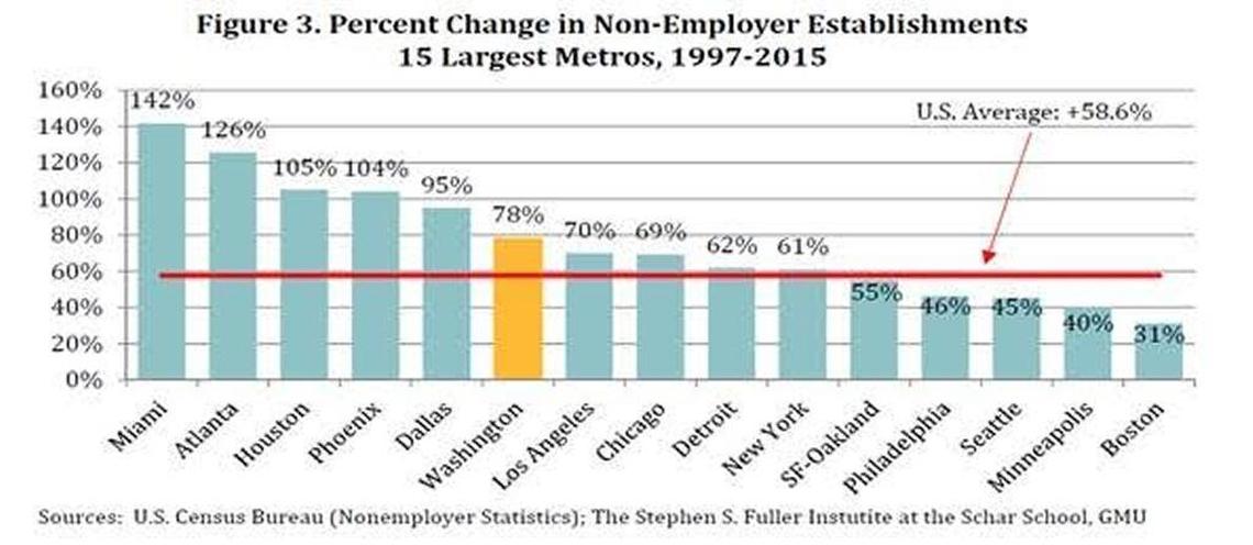 Between 1997 and 2015, the number of non-employer establishments in the Miami metropolitan area rose 142 percent, more than twice the rate of the national average, 58.6 percent, the report found. The second-fastest growing metro area, Atlanta, grew 126 percent, while Dallas grew 95 percent, Washington, DC, grew 78 percent and Boston 31 percent.