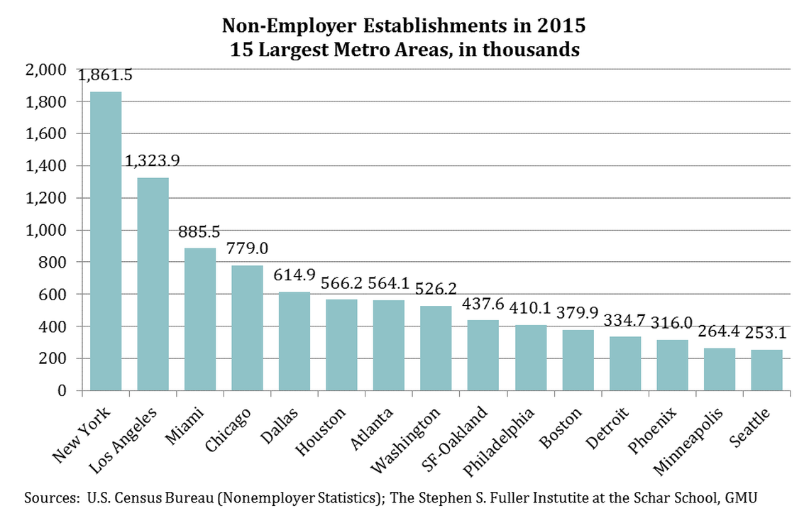 On a national scale, the U.S. has also experienced significant growth in non-employer establishments growing from 15 million in 1997 to more than 24 million establishments in 2015, the report showed.