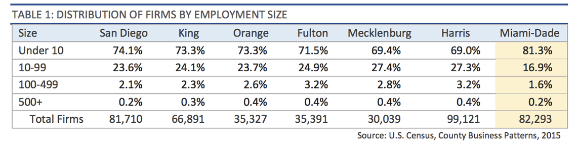 Most Miami-Dade workers now work in businesses with fewer than 500 employees. Compared with other major metros, Miami now has an inordinate share of small businesses comprising its economy; 81 percent of the county's 73,764 firms employ fewer than 10 people.