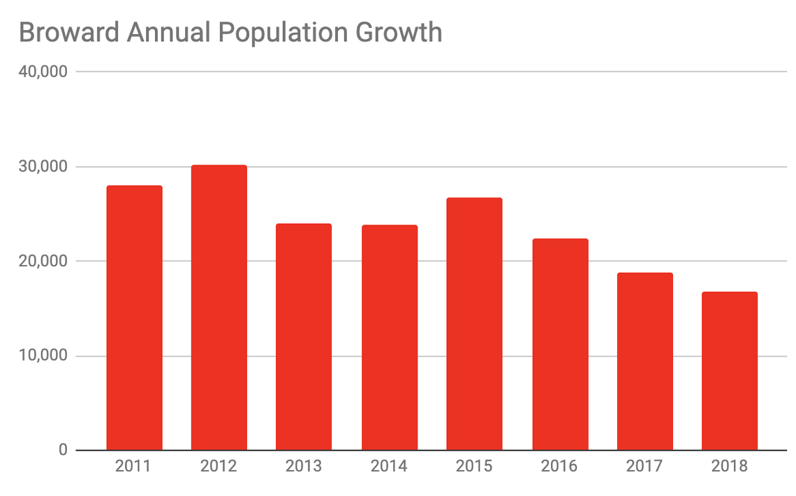 Over the same period, Broward’s population grew a total of 16,789 — the lowest increase since 2011.