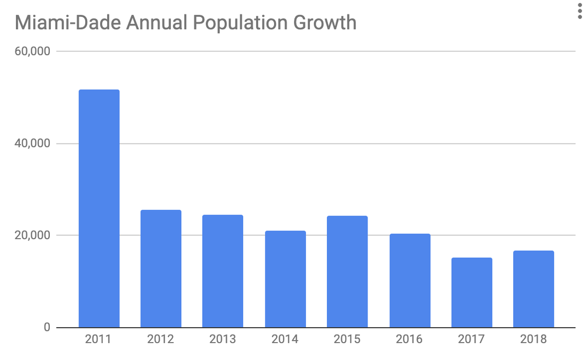 Between July 2017 and July 2018, Miami-Dade’s population grew a total of 16,703 — the second-lowest increase since 2011.