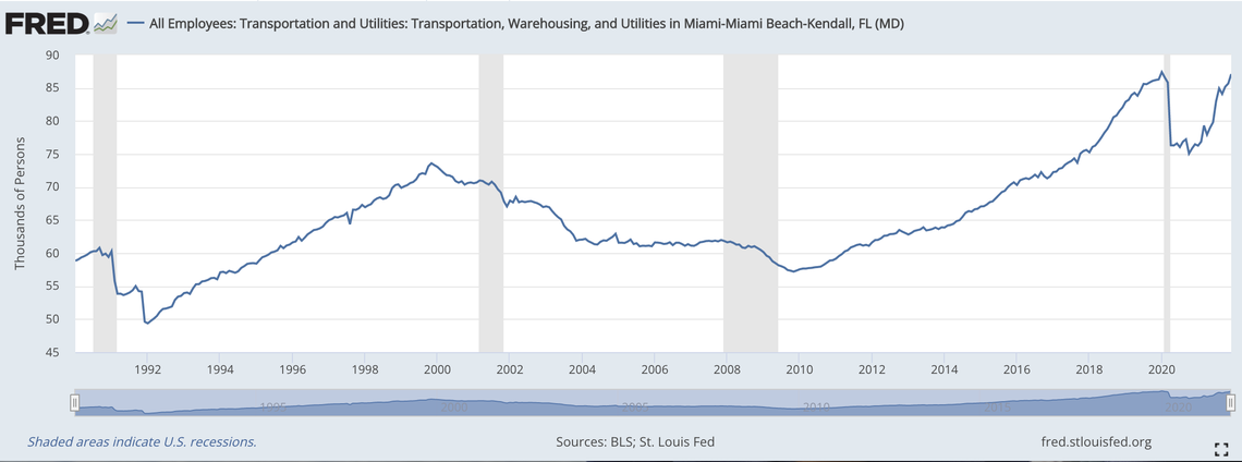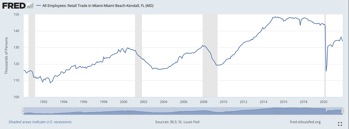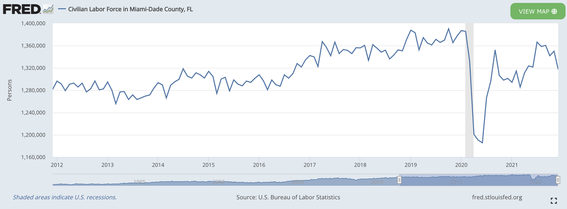 Experts say joblessness that low is ultimately a mixed blessing for the local economy. As workers like Arniella are moving on from the traditional labor force, local businesses are struggling to find qualified employees, even as the unemployment level declines. Data show that Miami-Dade’s civilian labor force remains well short of pre-pandemic levels — and may never fully recover.