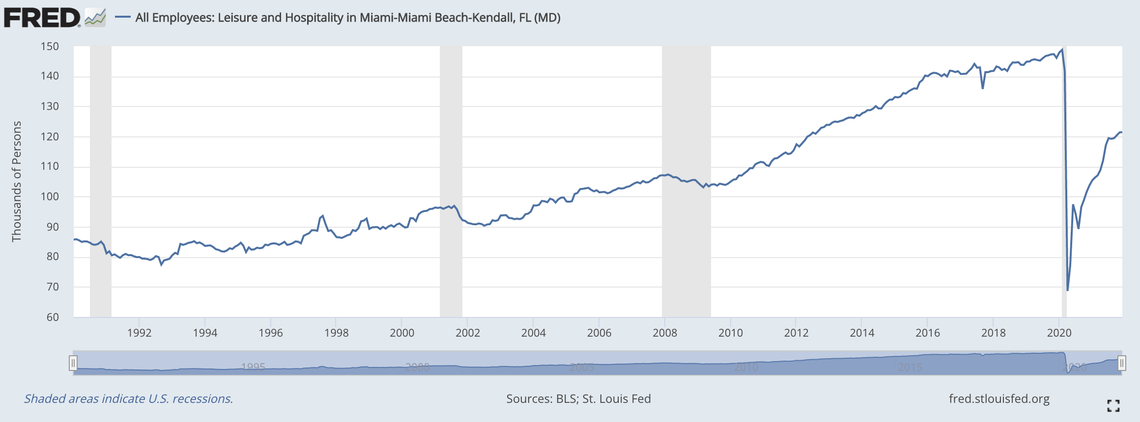Indeed, leisure and hospitality employment in Greater Miami remains 28,000 workers short of pre-pandemic levels.