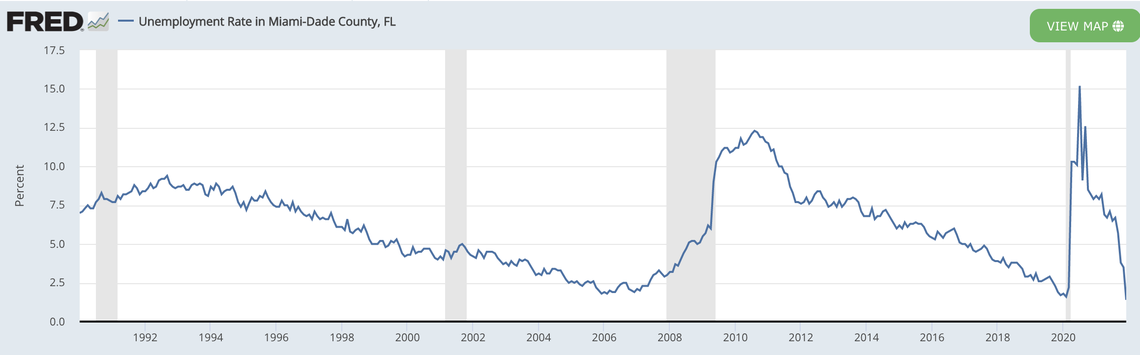 It is former workers like Arniella that helped push Miami’s jobless level in December to 1.4%, the lowest mark since at least 1990 when the U.S. Bureau of Labor Statistics started compiling county unemployment figures. That is the latest data available and even lower than the 1.6% rate in February 2020, just before the pandemic.